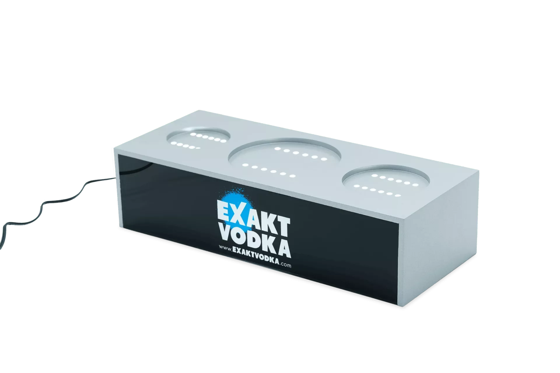 Der Exakt Vodka LED-Flaschenständer sorgt für eine moderne und hochwertige Präsentation von bis zu drei Exakt Vodka Flaschen. In zeitlosem Grau mit schwarzer Front gehalten, fügt sich der Ständer dezent in jede Barumgebung ein und setzt die Flaschen dank integrierter LED-Beleuchtung optimal in Szene.